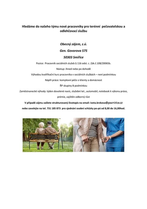 Úvod > Dění v obci > Novinky > Nabídka zaměstnání -Pečovatelská a odlehčovací služba Obecný zájem - Smiřice
