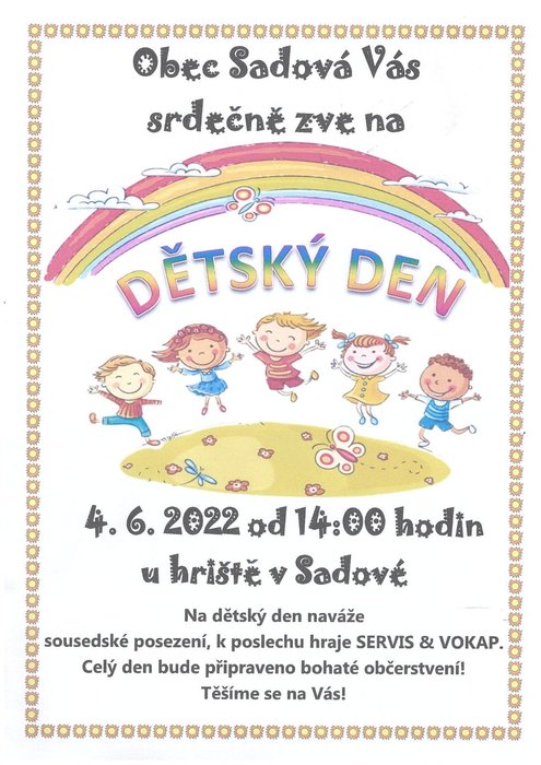 Úvod > Dění v obci > Novinky > Pozvánka Dětský den - Sadová - 4.6.2022